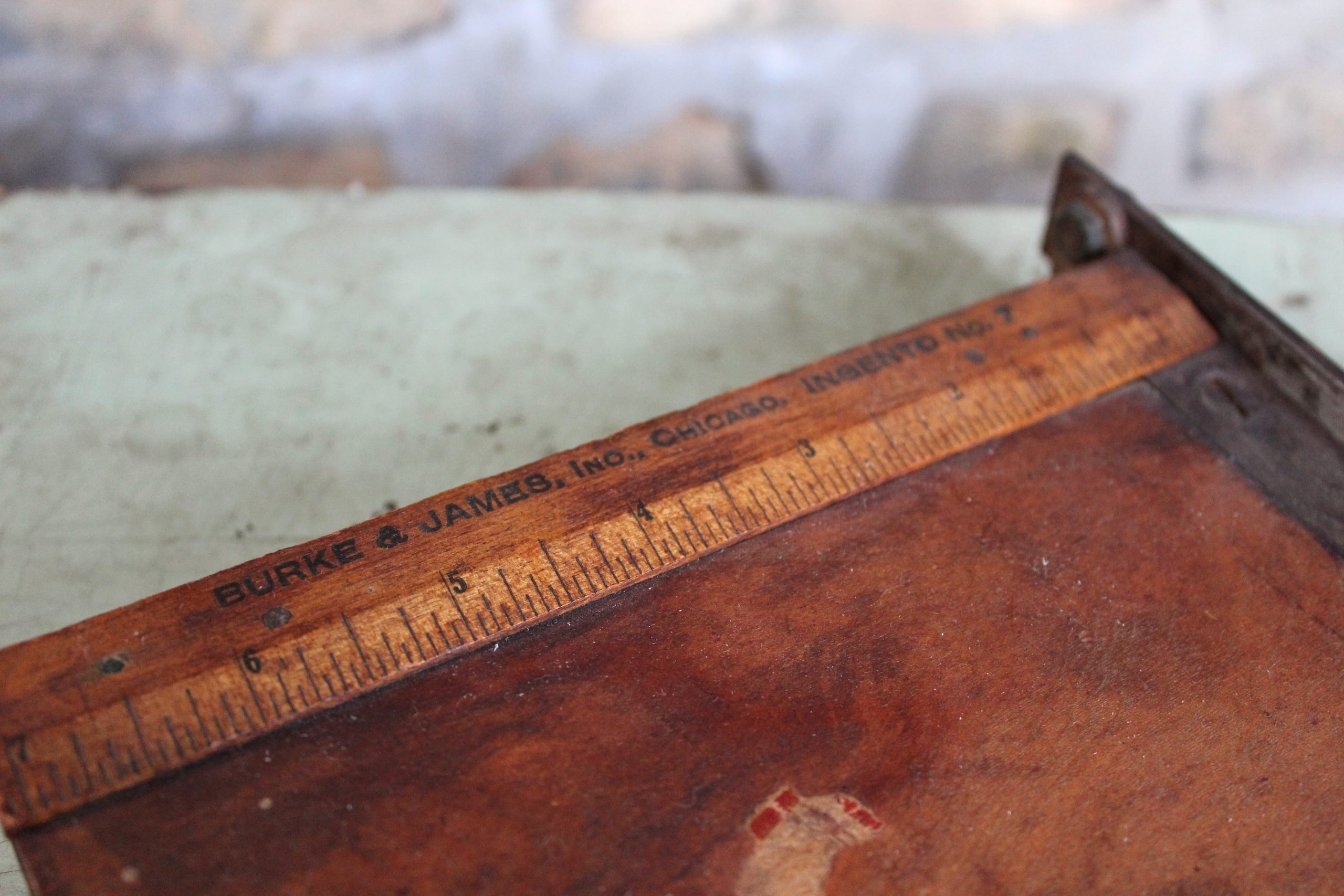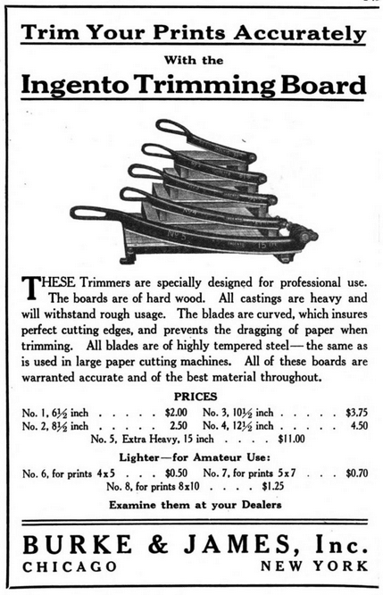 The Ingento No. 7 was Burke & James’ custom-made guillotine / trimming board for 5×7″ photographic prints. The “Ingento” brand, like the “Rexo” and others, was used liberally across a lot of the Burke & James product lines, including some of the actual cameras themselves. As the advertisement below indicates, there were at least seven other Ingento paper cutters by 1919, and the No. 7 was the baby of the bunch—lightweight and acceptable for “amateur” use. It cost 70 cents in 1919, which equates to about $10 today.