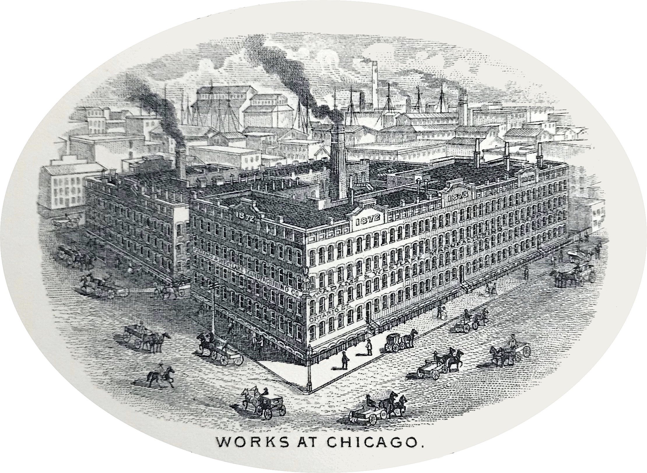 John Crerar, whose name lives on through a substantial personal library now housed at the University of Chicago, was just as essential to the early development of the Adlake business as either of the gentlemen memorialized in its trademark. Taking the slightly younger Adams under his wing, Crerar helped establish the original company offices at 11-13 Wells Street, along with a state-of-the-art new factory on Franklin Street, between Ontario and Ohio Street. When these properties were then swiftly torched and reduced to rubble in the Great Fire of ’71, Crerar financed much of the rebuilding effort, opening new buildings in the same locations within a year or two (interestingly, Wells Street was known as Fifth Avenue for much of the late 19th century, as city officials decided that the seedy stretch of road could be seen as an insult to Mr. Wells himself).