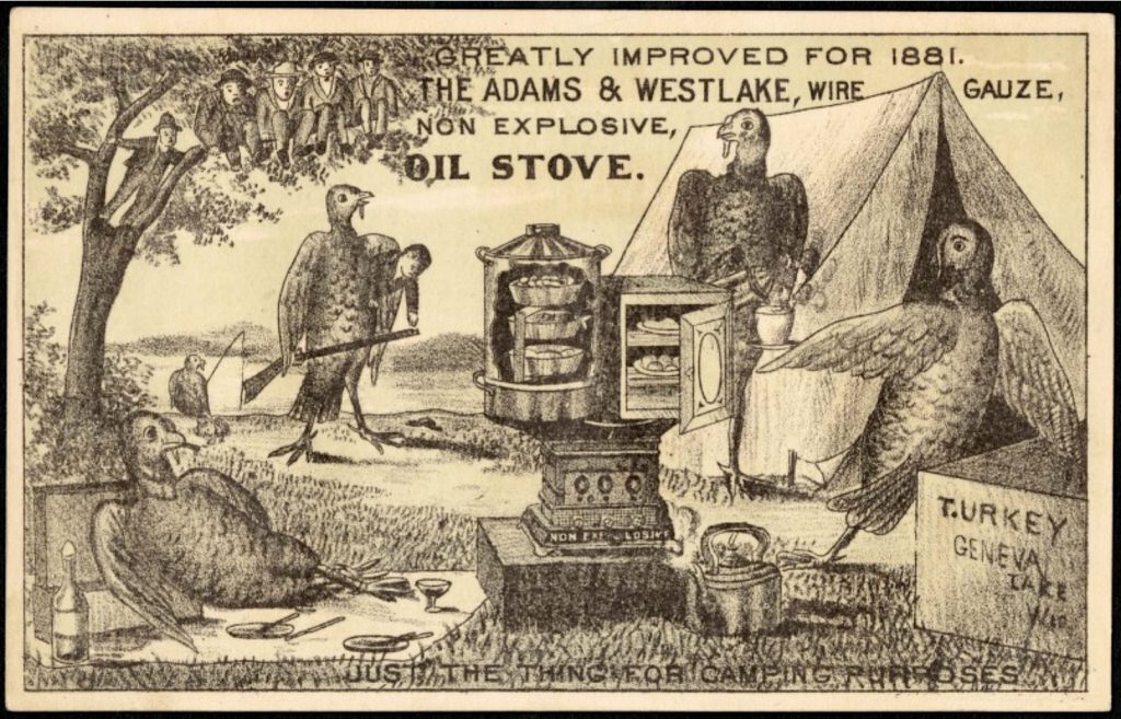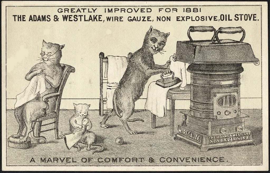 [Two examples from a very weird set of anthropomorphized animal promo cards that Adams & Westlake released in 1881 to market their non-explosive oil stove]