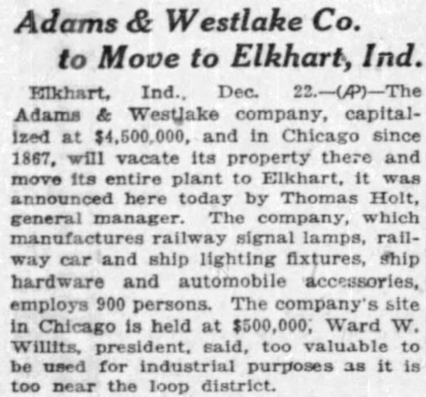 Unfortunately, Adlake still employed 900 Chicagoans at the time of its move in 1927, and while some migrated with the business to Elkhart, many others were out of work. Any future innovations from the railway appliance kings would have to come from the Hoosier State.