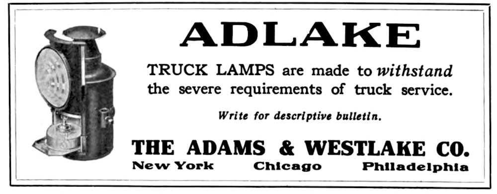 According to a page in the 1920 catalog of the Pittsburgh Auto Equipment Co., “the Adlake Line of Truck Lamps was put on the market to meet the demand for a lamp which would withstand the severe conditions imposed upon them in truck service. The bodies are made of steel and the lamps are constructed with the Adlake Balanced Draft Ventilation which insures proper burning and a clear lens under all weather conditions.