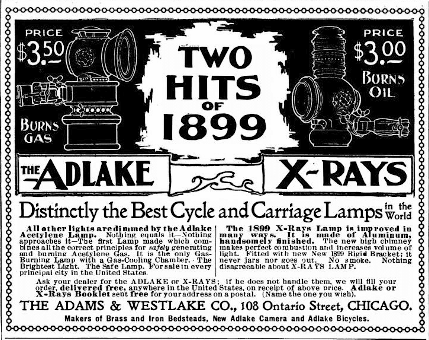 All things considered, 1889 was not a great year for J. McGregor Adams. His murdered nephew was deemed worthy of his own slaying, and his good friend and business partner Crerar died a few months later, leaving the future of two enormous enterprises in Adams’ hands. Rather than cowering under the pressure or playing it safe, though, Adams seemed to open the playbook again, moving the Adlake brand into some previously uncharted territory, including major production of brass bed frames and bicycles (with specialized bicycle lamps to go with them). The ADLAKE line of bikes was eventually acquired by the Great Western MFG Co. of LaPorte, Indiana, but the respected name brand was retained into the early 20th century.