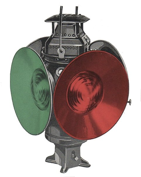 The ADLAKE-Newbold system was later introduced to motor cars, too, but up through World War I and beyond, more traditional oil lamps remained quite common on the open roads, as well as the railroads. These early 20th century signal lanterns were often called “non-sweating” lamps, which meant they were “designed to eliminate precipitation of moisture or ‘sweating,’ irrespective of varying temperatures or wind pressure.” This kept lenses clear and shining through; reduced corrosion of the lamp bodies; and protected the burner flame from high winds.