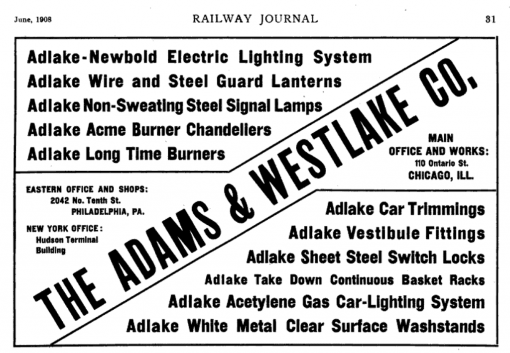 “The word ‘ADLAKE,’ the trademark of the company, has become synonymous with the word ‘BEST’ in the minds of the careful buyers in the railway field,” claimed a 1911 Adams & Westlake Co. advertisement. And indeed, that reputation was carrying into other, more modern modes of transport, as well.