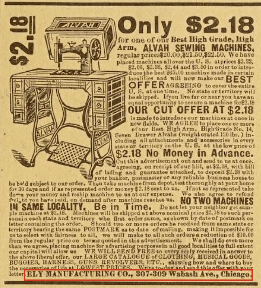 The Ely Manufacturing Company, incorporated in November of 1893 at 307 Wabash, appears to have quickly picked up the mantle after Alvah MFG folded into Sears, Roebuck & Co. From the time of its incorporation through much of 1894, all subsequent advertising for the Alvah Sewing Machine lists Ely as its producer, while using much of the same language and cheeky sales tactics from the Richard Sears playbook. One logical conclusion is that some of the same individuals employed by the defunct Alvah MFG Co. essentially re-organized the same business under the Ely name.