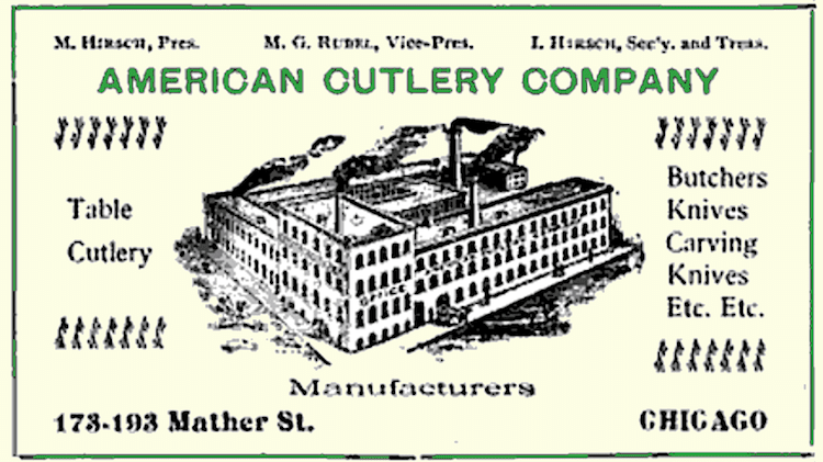 Made by: American Cutlery Co., 732-764 Mather St. (W Lexington St.), Chicago, IL [University Village]