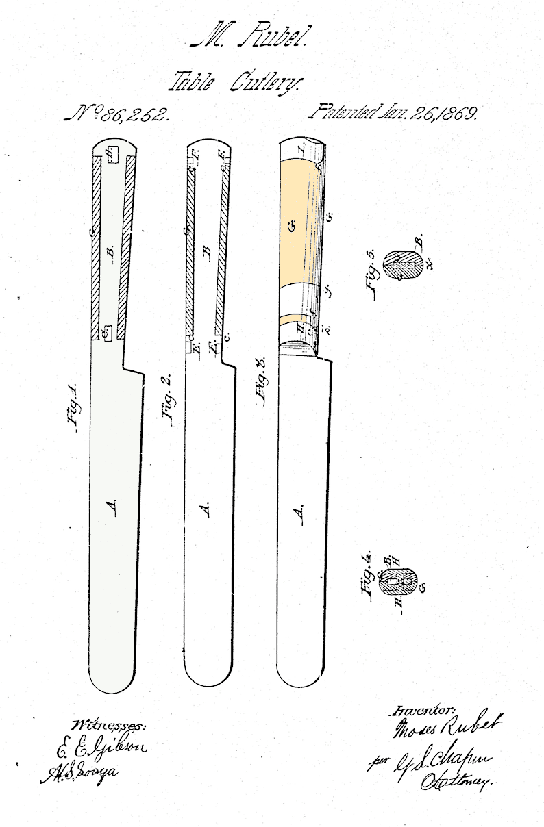 [Moses Rubel patent drawing for “table cutlery,” 1869]