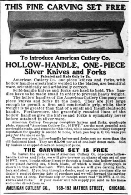15. Hi there. I am trying to date a set of ten knives and a carving set made by American Cutlery Company. The handles are mother of pearl and the band is marked sterling.