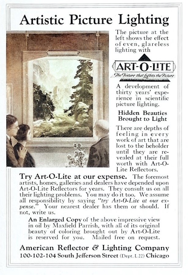 “There are depths of feeling in every work of art that are lost to the beholder until they are revealed at their full worth with Art-O-Lite Reflectors.” —American Reflector & Lighting Company advertisement, 1923