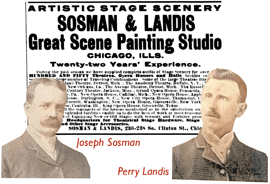 The Sosman & Landis Scene Painting Studio itself was established around 1877 by Joseph S. Sosman and Perry Landis, a pair of Civil War veterans who’d formed a lucrative partnership specializing in “scenery for halls,” as an early 1879 advertisement in the Chicago Tribune described it. Sosman was the creative force and a gifted artist, while Landis showed more of a penchant for sales, schmoozing with theater owners to collect contracts.