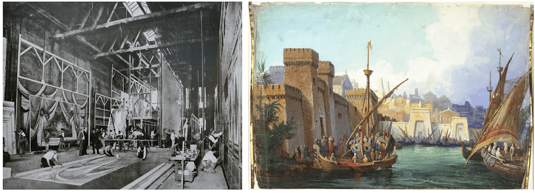 [Left: Inside Sosman & Landis’s Chicago studio, from collection of Dr. Wendy Rae Waszut-Barrett. Right: Backdrop design by Sosman & Landis, from the Holak Collection, Performing Arts Archives, University of Minnesota Libraries]