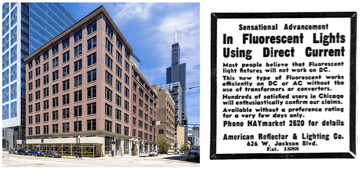 [Left: 626 W. Jackson Blvd, where American Reflector’s office was located during the 1940s and ’50s. Right: 1942 advertisement for the company’s “Sensational Advancement in Fluorescent Lights Using Direct Current.”]