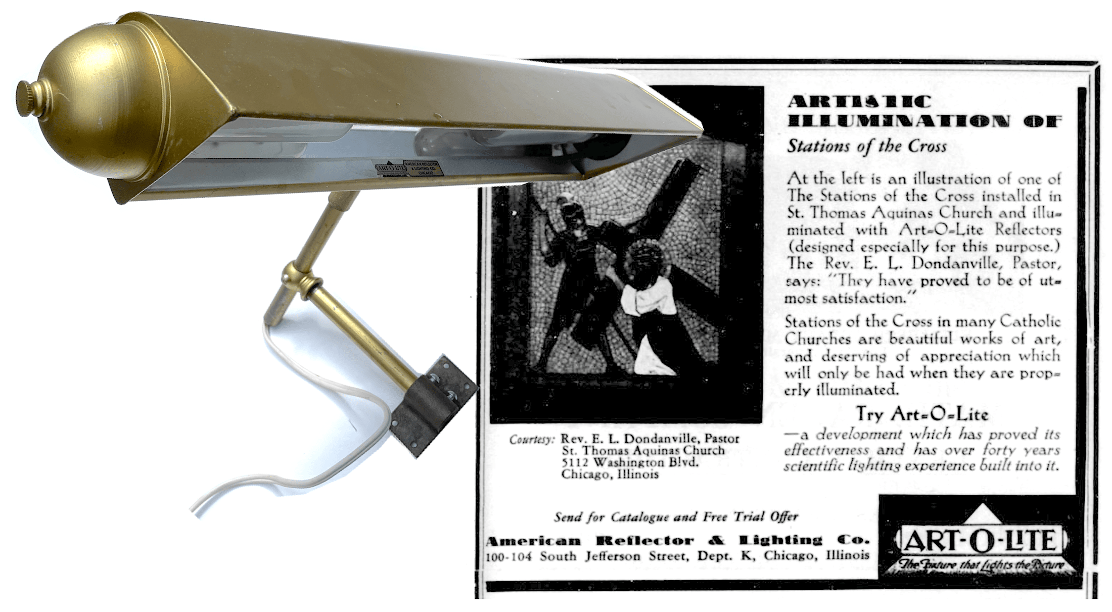 “The Fixture that Lights the Picture,” read the tagline to a 1923 ad for the Art-O-Lite, American Reflector’s leading product for much of the mid 20th century, and the same artifact featured in our museum collection. “The foremost artists, homes, galleries and dealers have depended upon Art-O-Lite Reflectors for years. They consult us on all their lighting problems. You may do it too. We assume all responsibility by saying ‘try Art-O-Lite at our expense.’ Your nearest dealer has them or should. If not, write us.”