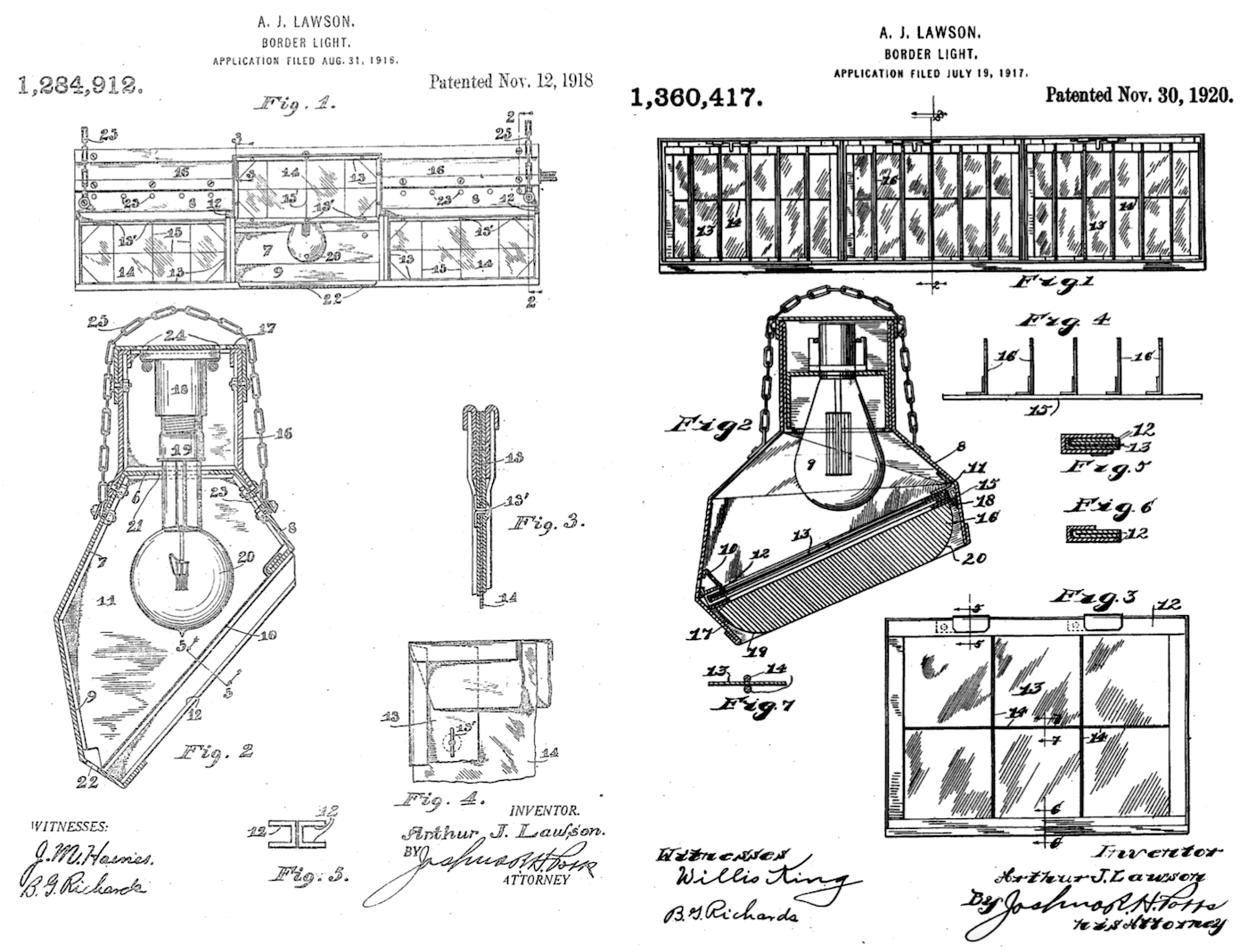 Evidence of Lawson’s potential engineering skills is scant but significant. Within his first year as a shareholder, he applied for patents on two inventions, both described as “border lights” (U.S. Patents 1,284,912 and 1,360,417). “My invention relates to improvements in border lights especially adapted for use along the border of a stage in a theater or as foot lights therefor,” Lawson wrote in his first application, which was ultimately approved in 1918. “The object of the invention is to provide a simple and effective construction of this character adapted to readily supply different colored lights for the stage.”
