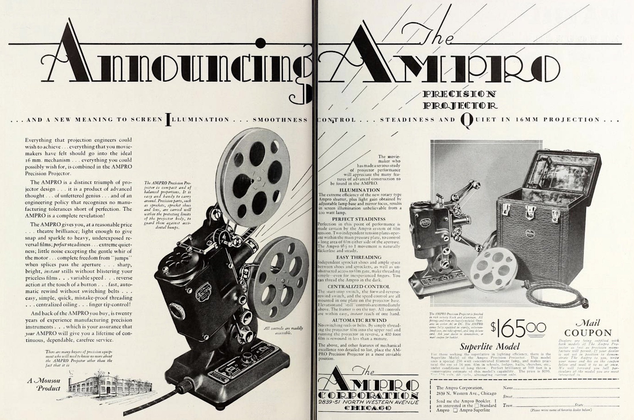 “Everything that projection engineers could wish to achieve . . . everything that you movie-makers have felt should go into the ideal 16mm mechanism . . . everything you could possibly wish for, is combined in the AMPRO Precision Projector.” —advertisement in Movie Makers magazine, April 1930