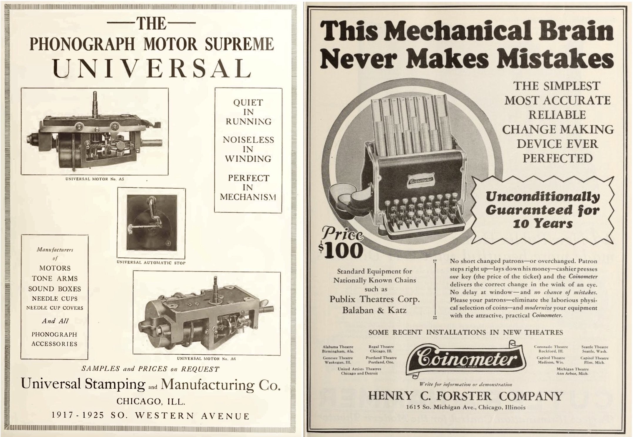 [Along with its own line of phonograph motors, tone arms, and other components, the Universal Stamping & MFG Co. also made a wide variety of products for other distributors, including the “Coinometer” change making machine sold by several businesses; in the ad above, the Henry C. Forster Co. of Chicago]