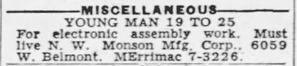 [1955 newspaper ad seeking a man for electronic assembly work at the Monson MFG Corp., 6059 W. Belmont Ave. The short-lived company was founded by Axel Monson’s sons Harry and Edgar.]