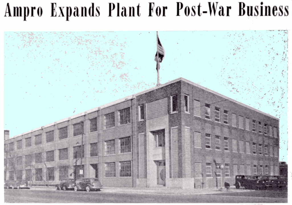 [In 1944, the Ampro factory at 2839 N. Western Ave. expanded both for military work and in anticipation of post-war civilian demand. This building is no longer standing.]