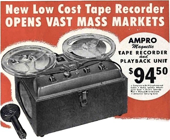 In 1951, Ampro advertised what it called the “World’s Lowest Priced Tape Recorder,” a reel-to-reel machine that adapted much of the functionality from the company’s old Amprosound projectors—motor rewind and fast forward, instant stop switch, carry-case portability, etc.