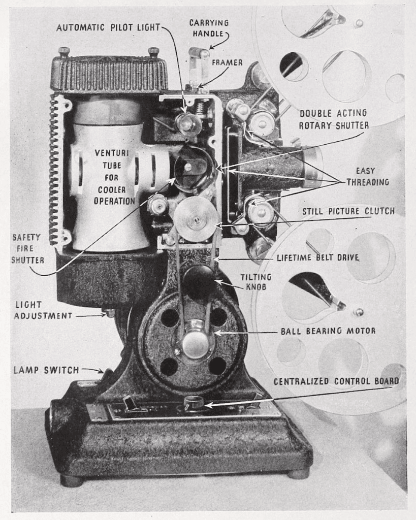 “The distinguishing feature of the new projector,” according to a 1925 edition of Educational Screen magazine, “is an ingenious mechanism by which the film, as it unwinds to be projected, rewinds into the original reel, which is thus constantly of the same size. . . . This is the form of projector that it is believed solves the problem of the use of motion pictures in schools—visual education—because it eliminates the necessity of an expert operator, and because at a range of 15 feet, or within the confines of the smallest classroom, the picture on the screen or wall is as large as that secured at a distance of 70 feet by an ordinary projector.”