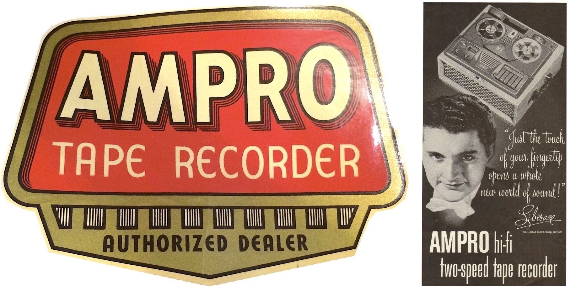 [Left: An Ampro authorized tape recorder dealer sticker. Right: Liberace endorsing the Ampro Hi-Fi Two-Speed Tape Recorder in 1954. By that point, manufacturing had moved to Rochester, NY, and Ampro’s remaining Chicago address was an office at 1345 Diversey Parkway]
