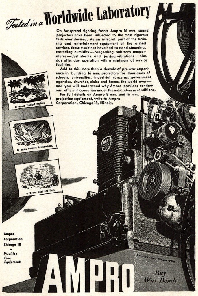 “Ask the man who has seen it in action! Men who have operated Ampro 16mm sound projectors the world over will tell you almost unanimously that Ampro projectors have come through the grueling tests of war with the highest record of performance. This fact is important to know when you are selecting the 8mm and 16mm equipment for bringing into your home the vast libraries of educational and entertainment films.”—Ampro advertisement, 1944