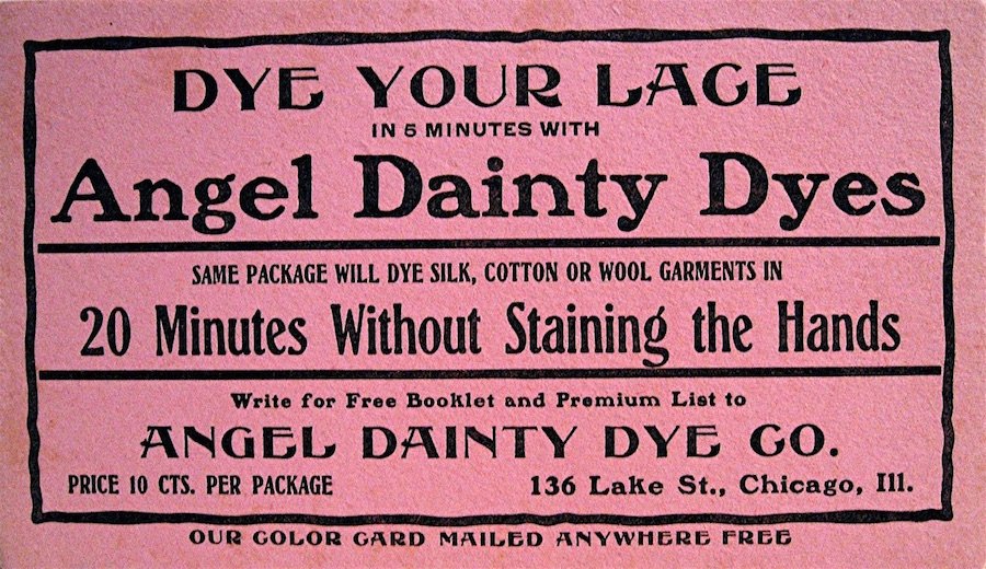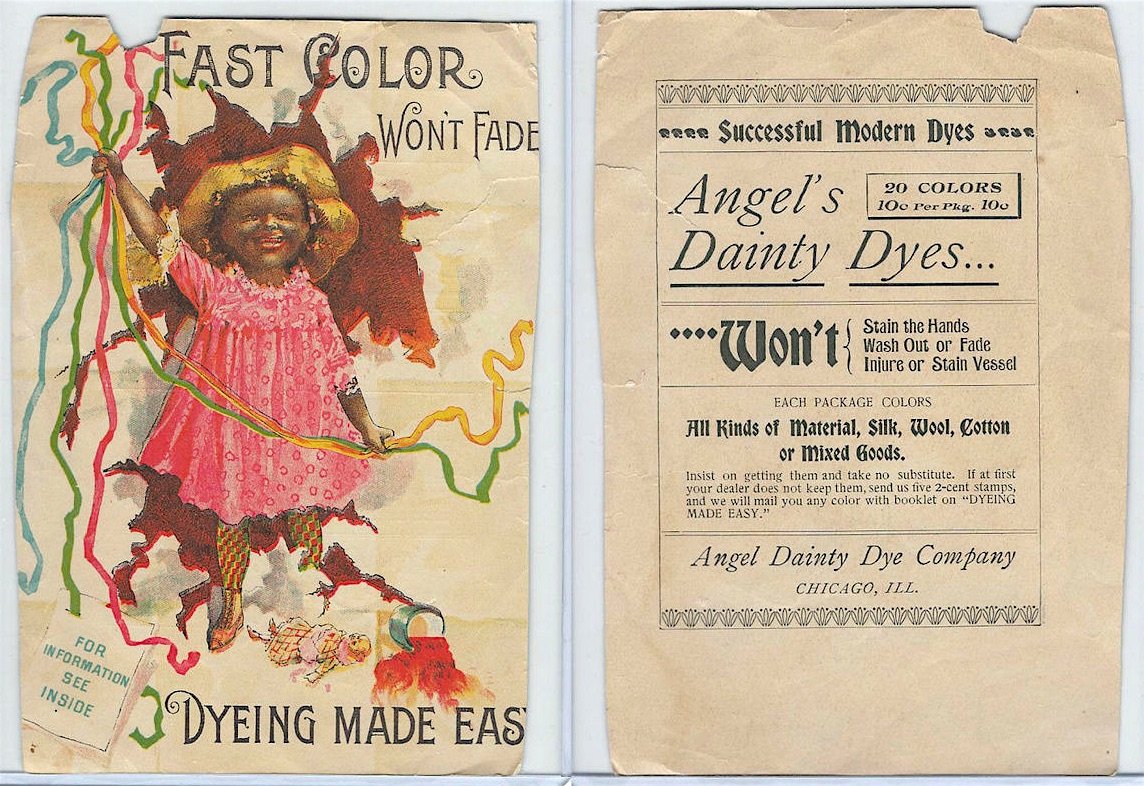 “The Angel Dainty Dye Co., Chicago, have something which everyone wants,” read an ad in an 1899 issue of the American Druggist and Pharmaceutical Record, “namely a dye which will not stain the hands nor the vessels in which it is used, and neither washes nor fades out of the fabric which is treated with it. Each package dyes cotton, wool, silk and mixed goods, an advantage over package dyes which has been very highly appreciated by the public.”