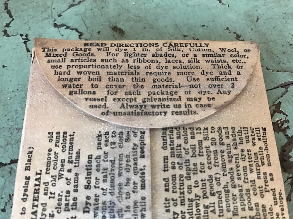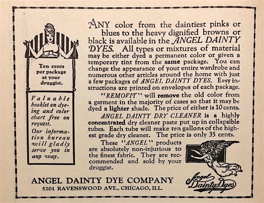 As for the Angel Dainty Dye Co., it rebounded well from its mildly embarrassing origin story to produce excellent—if not entirely heavenly—products for much of the early 20th century. The company’s artful dye packets, available in a wide range of colors at about 10 cents per pack, were common household solutions for tinting or for bringing faded color back to life in dresses, draperies, and even the feathers in ladies’ caps. The dyes were sold in drug stores, laundries, and in major catalogs like Sears Roebuck, and they continued to promise vibrant colors and even cleansing powers with no staining, all achievable in just a 20 minute wash. The secret formula had been right there in their hearts all along!