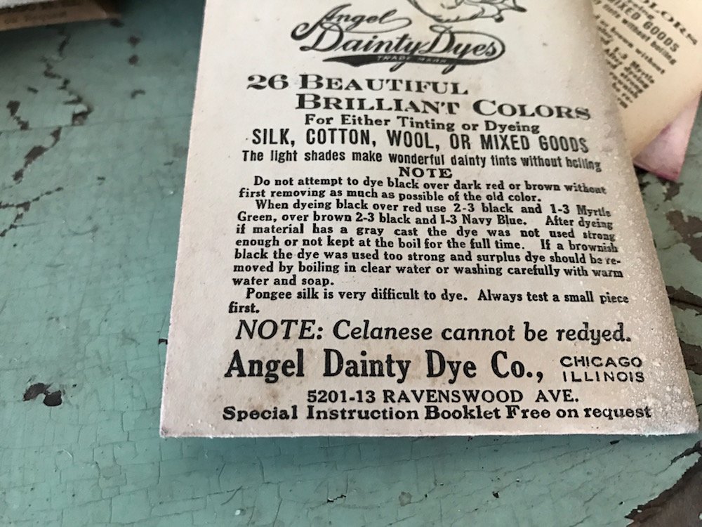 If you have some old Angel Dainty Dye powders and have an ill-conceived notion of dyeing something in your house “the old fashioned way,” the 100 year-old directions on the ADDCo. packets should still apply. By the 1930s, the dyes were available in “26 Beautiful Brilliant Colors,” including winners like Heliotrope, Cerise, Golden Ecru, and . . . Pink. The packets also advised ways to get certain desirable tints—for a “champagne” color, use tan, for “tearose,” use salmon, etc.