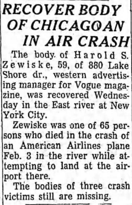 In fact, his career experienced a considerable upswing after World War II. Through his role with Conde Nast, he’d become the western advertising manager for Vogue magazine, and soon upgraded to a fancy new high-rise apartment at 880 N. Lake Shore Drive. Then, on February 3, 1959, Harold Zewiske said farewell to his 88 year-old mother and boarded a flight at Midway Airport bound for New York’s Laguardia—likely for the purpose of attending a meeting at the Vogue offices.