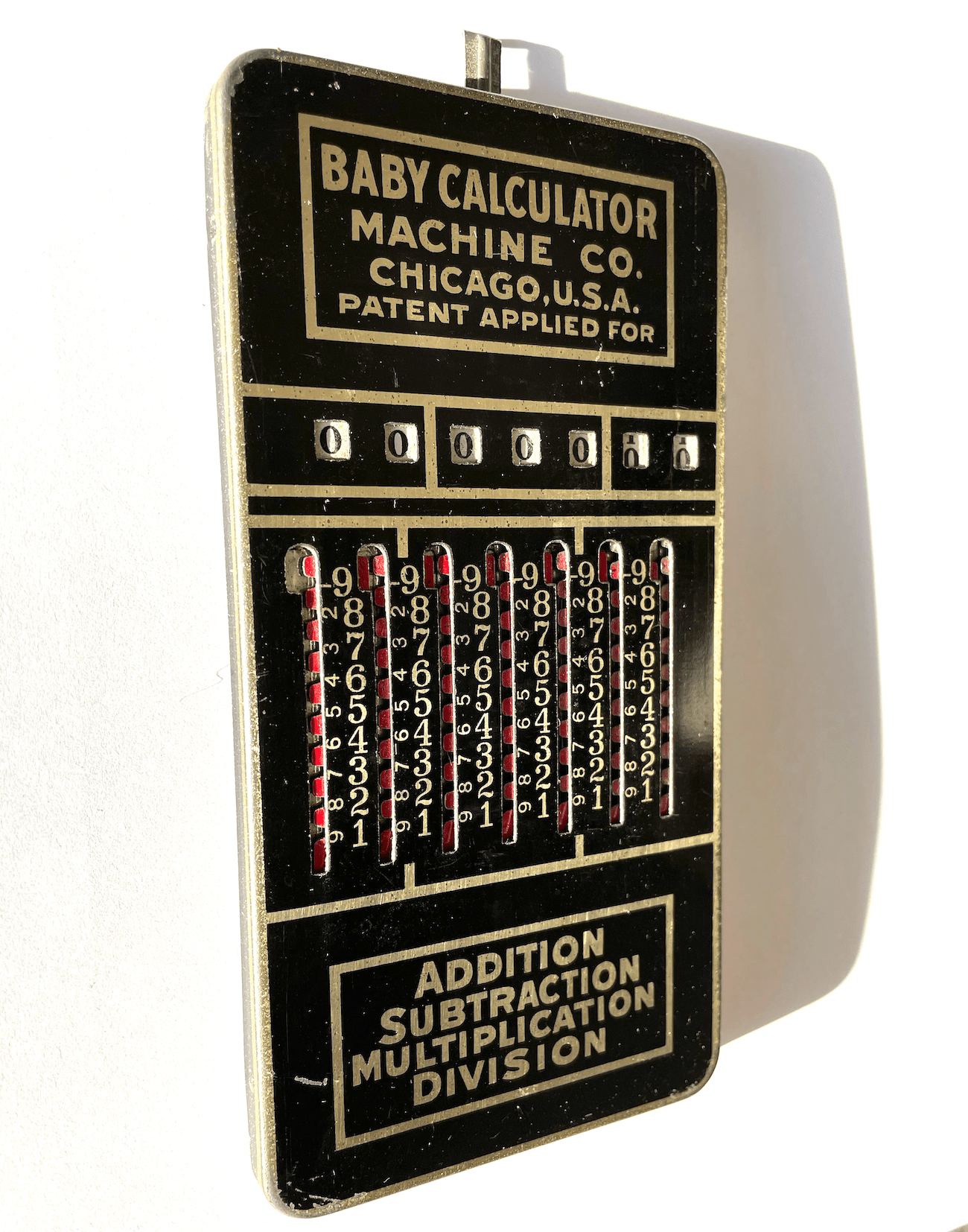 “Does the work of a $300 machine,” a 1929 ad claimed, juxtaposed with the $2.50 price tag. “Guaranteed 5 years. NOT A TOY. Made of steel and indestructible. Will not make mistakes. So simple a child can operate it. Everybody should carry one for figuring.”