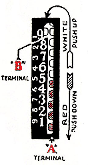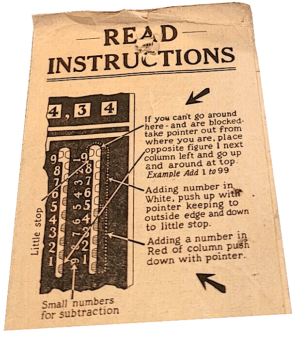 “IMPORTANT– Remember that in each operation ADDING, the pointer must go all the way down to terminal ‘A’ when numbers to be added is opposite RED of column and all the way up and over to the left and down to a stop at terminal ‘B’ when adding figure opposite WHITE of column.”