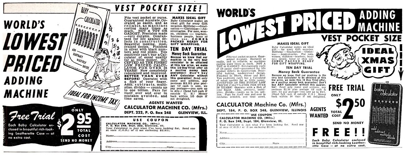 [Post-war ads for the Baby Calculator after its sale and move to Glenview, IL]