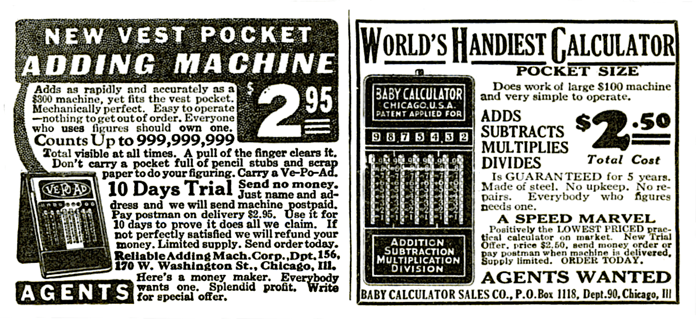 [Baby Calculator advertisement (right) appearing right beside an ad for its slightly pricier rival, the Vest Pocket Adder, aka Ve-Po-Ad, in a 1928 magazine]