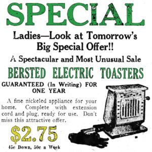 “You women who have longed for an electric waffle mold—” the ad read, “you women who have yearned for an electric toaster—can now have BOTH, AT LESS THAN ONE HALF THE REGULAR PRICE. . . . The Toaster is full size and of exceptionally superior quality. Its highly nickel-plated surface adds to its very attractive design. Will toast two large slices of bread to a tempting golden brown. Toasts both pieces at the same time. A quick acting toaster that lives up to its name (IN-A-FLASH). Fully guaranteed heating element. Comes equipped with full length heater cord. The regular retail price of this household gem is $5.”