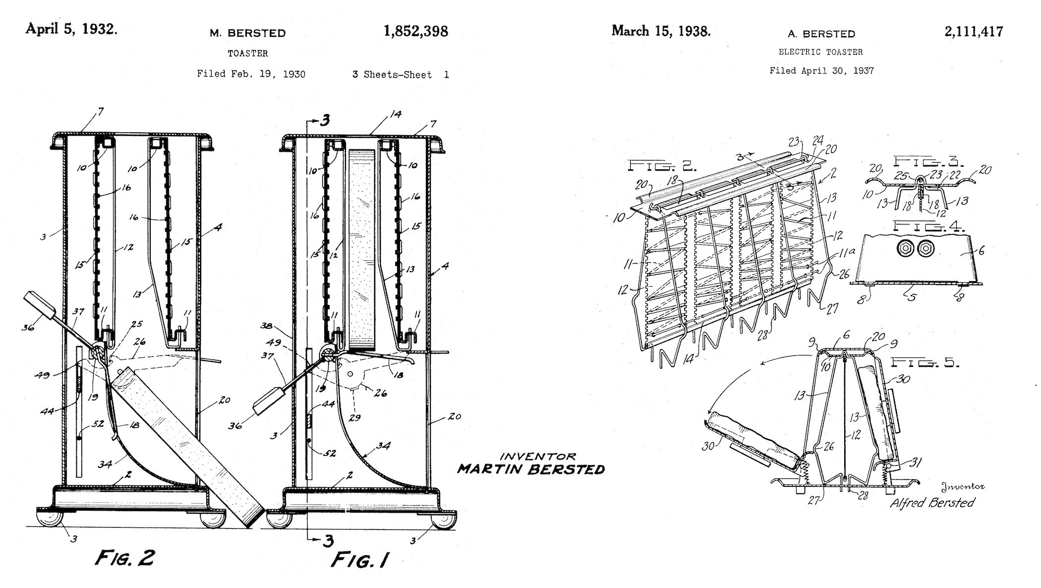[Two toaster patents belonging to the Bersted MFG Co. using the flip-flop model: 1930, designed by Martin Bersted, and 1937, designed by Alfred Bersted]