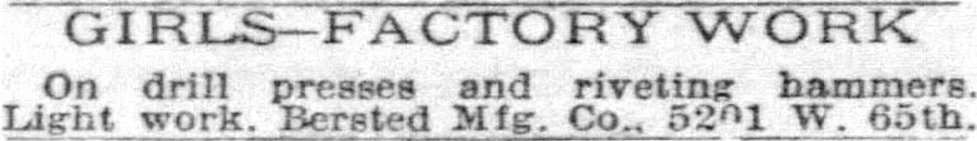 [This 1926 wanted ad from the Tribune indicates that a good portion of Bersted’s factory workers were young women, trained to operate the machinery that pieced together the company’s appliances.]