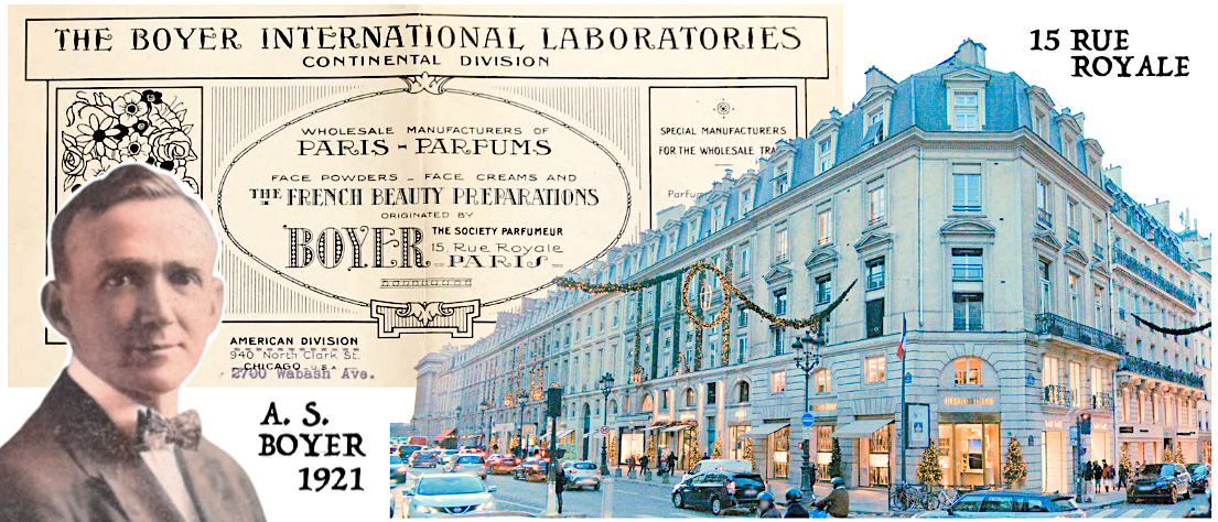 A Chicago cosmetics dealer claiming to have “an establishment in Paris” might feel akin to a Chicago high schooler having a “girlfriend in Canada.” But, as best we can tell, Boyer and his wife Marie really did enjoy a cross-Atlantic life, establishing a second, seasonal home at 15 Rue Royale, according to a 1926 directory of “Americans in France.” The Boyer business operated out of this same address, maintaining offices and a purported “laboratory” in the heart of Paris, while factory production was handled by the company’s “American Division” in Chicago.
