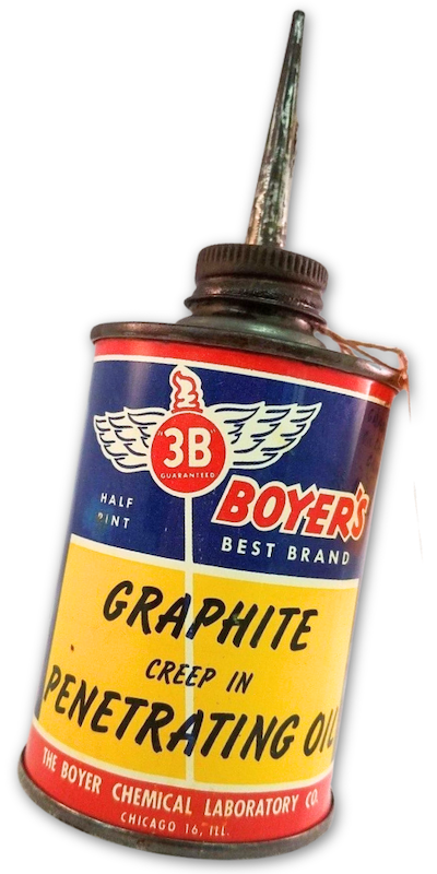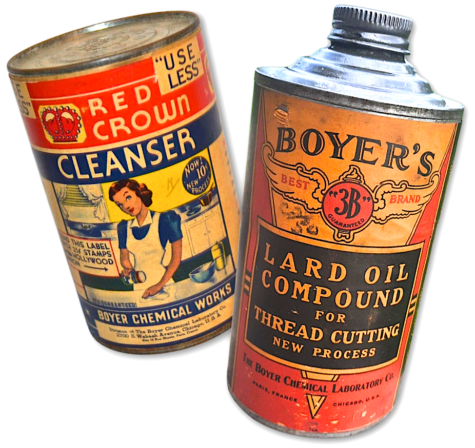 A Boyer Chemical Laboratory Co. invoice from 1932 reveals the extent of this line, including toilet bowl cleaner, “Laundry Wonder” washing compound, “Kill ‘Em All” household insecticides, soldering pastes and salts, pipe joint compound, metal and furniture polishes, “farmer’s necessities” (including “hog oil”), and a broad array of automotive accessories—including valve grinding compounds, radiator cement, glossy auto paint, waxes, and the “Get Those Canary Birds” brand of anti-squeak penetrating oil. The two best known commercial lines under the Boyer banner, though, were probably its “3B” (“Boyer’s Best Brand”) and “Red Crown” trademarks, used on oil compounds and household cleaners, alike.