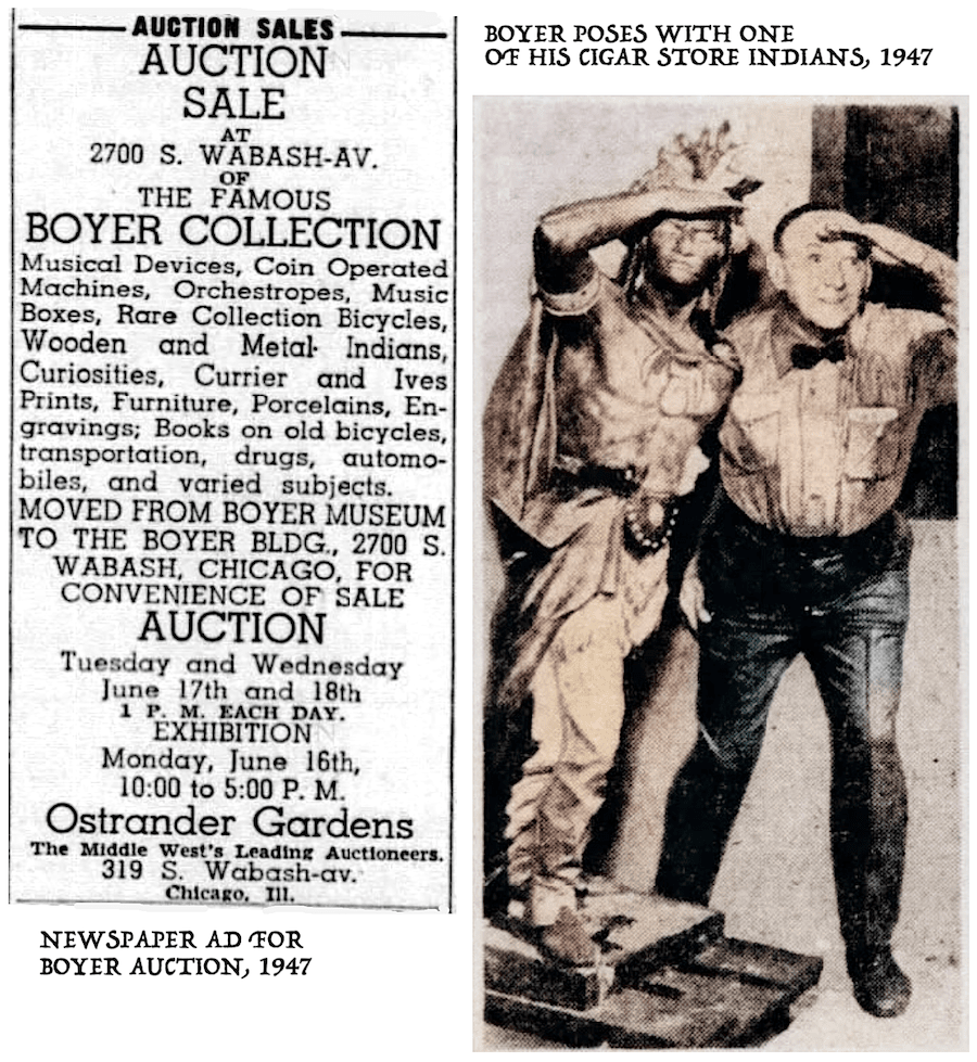 In 1947, a 60 year-old Alden Scott Boyer made headlines around the country as he began the process of unloading some of the bizarre collections he’d spent half his life acquiring. In one example, he sold off all of his man-sized tobacco store Indians—plus some prized jukeboxes and slot machines—during a two-day auction in Chicago. A newspaper report described Boyer as “a large, ruddy-faced man” who spent the auction “perched on a merry-go-round horse left over from the World’s Columbian Exposition of 1893, watching his ‘toys’ going to the highest bidder.”