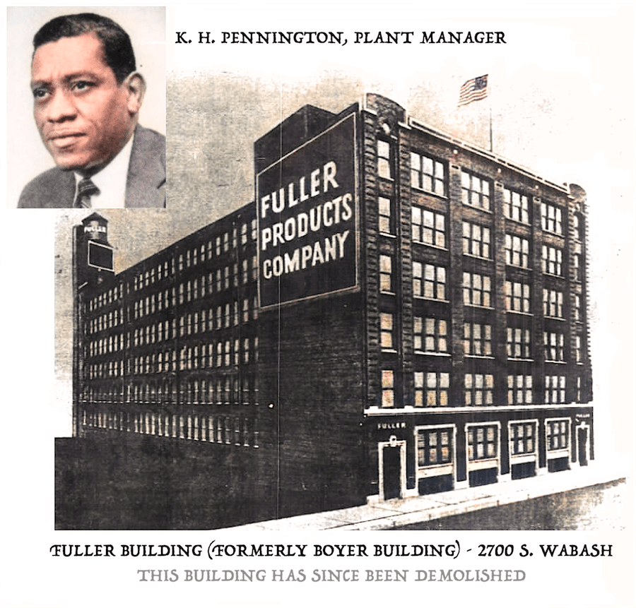 Samuel B. Fuller took over the reins of Boyer International and kept the factory running at 2700 S. Wabash, re-christening the “Boyer Building” as the “Fuller Building” and installing one of his top men, K. H. Pennington, as the new plant manager (another employee, a low level chemist named George Johnson, would go on to form the hugely successful Johnson Products Company). Pennington helped bring the factory into the modern age with more automatic machining, and the pay-off was swift. According to a later account in Black Enterprise magazine, Fuller’s business “soared with the acquisition of Boyer. Sales volume peaked at $10 million. By 1958, 60 percent of the Fuller business was through the Boyer line throughout the South.”