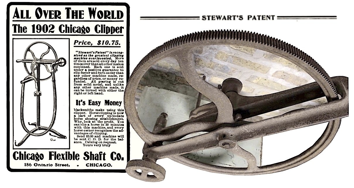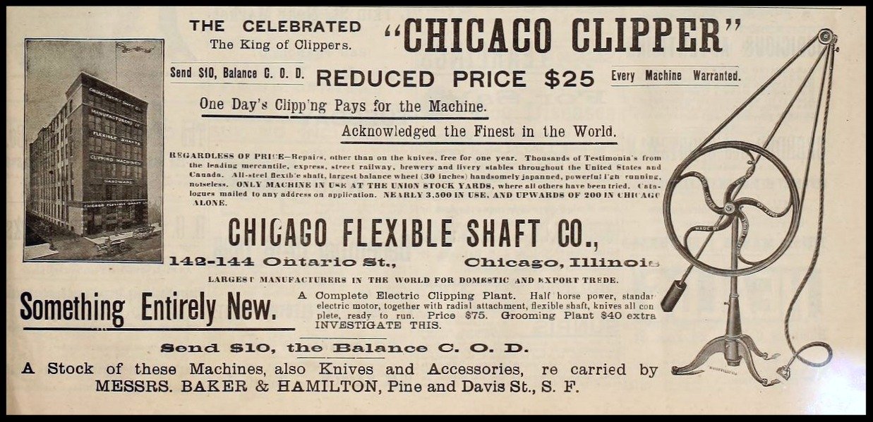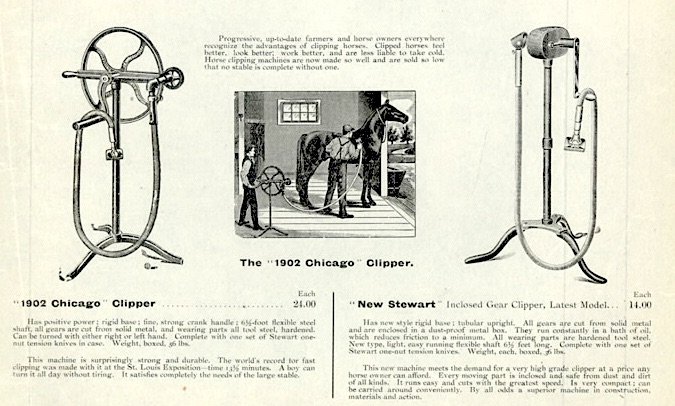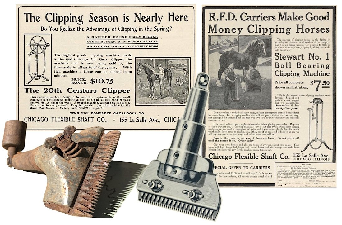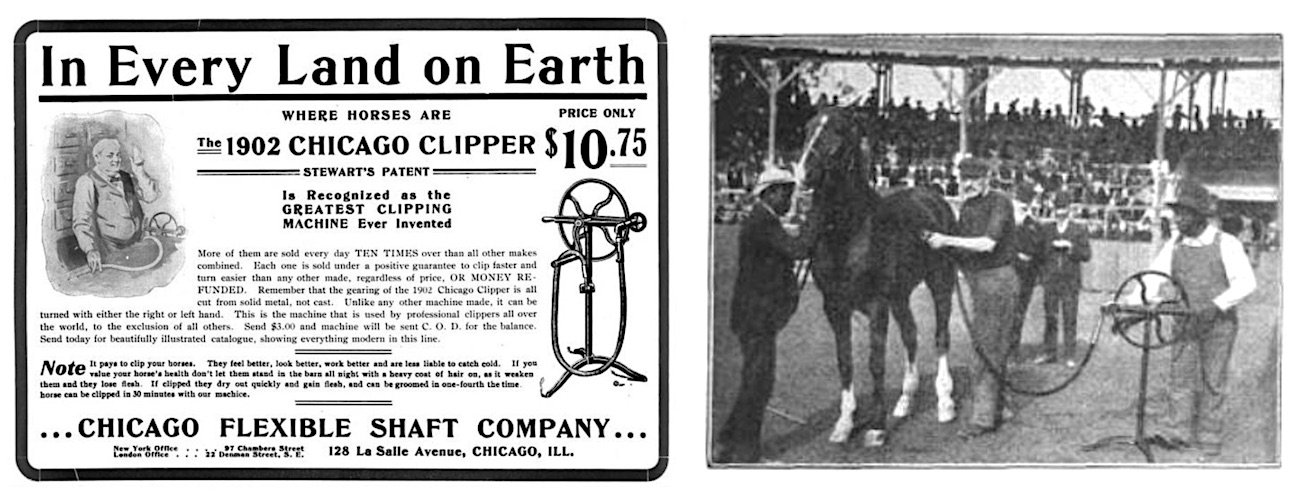 “The Chicago Flexible Shaft Co. have recently placed on the market the New ’98 Chicago Clipper, price $12.75, which has practically revolutionized the horse clipping business,” reported the Blacksmith and Wheelwright in December of 1897. “The machine is made on the same principle as the chainless bicycle, and is destined to supersede all old style two-hand horse clippers, and also the old-fashioned, high-priced belt machines.”