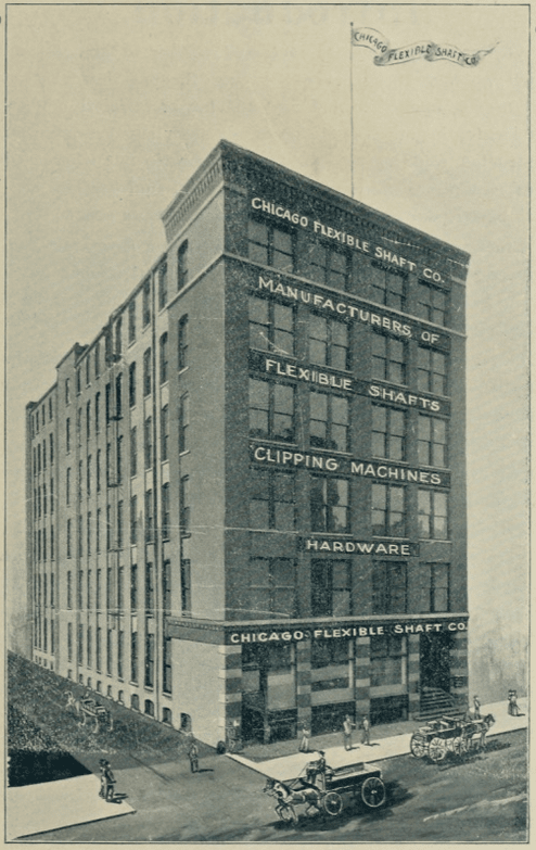 As the 20th century began, the Chicago Flexible Shaft Company had already become the self-described “largest makers of Flexible Shafts in the world,” and no competitors could really make a case against them. More than just a sheep and pony operation, the company’s patented eponymous products could be easily adapted for a myriad of other uses, creating new clientele in loads of industries: “ship yards, railroads, machine shops, foundries, glass works, and thousands of other manufacturers.” All that production required yet another expansion of factory space, as CFS migrated down the street to an even larger complex at the corner of Ontario and LaSalle (the original building is no longer there, but its replacement, built in the 1920s, is now known as 620 LaSalle).