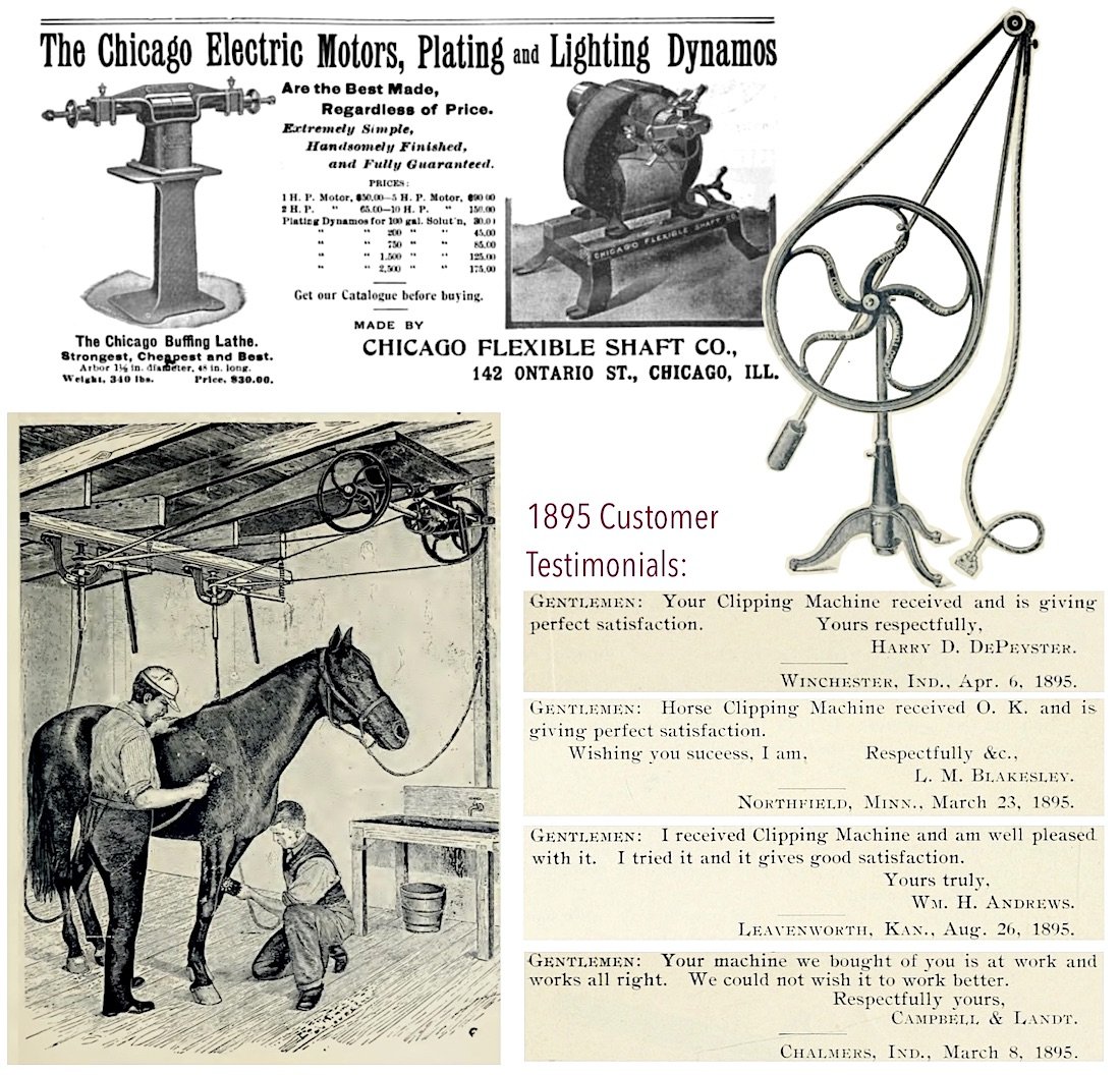 [Besides clippers, Chicago Flexible Shaft also made buffing lathes, electric motors, plating and lighting dynamos, as noted in the 1895 ad above. Some customer testimonials for the company’s early clippers, also from 1895, showcase the VERY tempered enthusiasm of the typical 19th century Midwestern farmer]