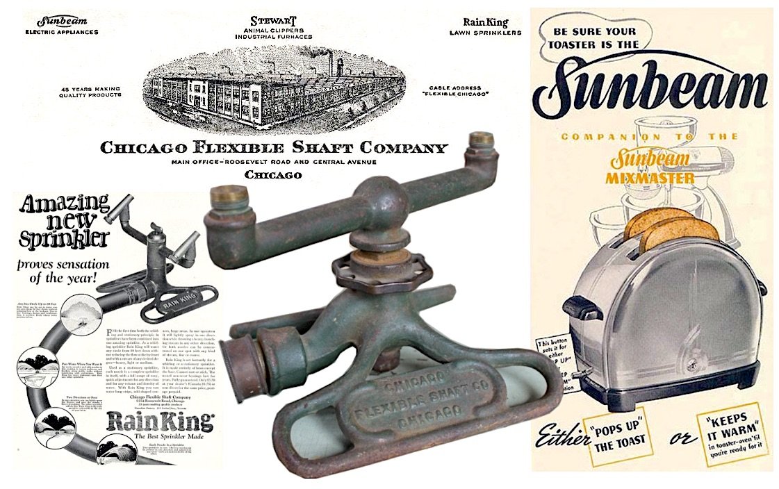 In due course, of course, smaller electric models sent these heavyweight machines out to pasture, but by that point, the Chicago Flexible Shaft Company had already lived up to its name and adapted—shedding its rural roots to make snazzy automobile accessories and kitchen appliances for America’s new urban modernia. If you’ve never heard of the business, it might be because it essentially “spun off” into two of the most successful appliance manufacturers of the 20th century, the Sunbeam Corporation (best known for toasters and mixers) and the Stewart-Warner Corporation (best known for speedometers)—each of which employed upwards of 4,000 workers in Chicago by the 1950s, earning them their own separate pages on this website.