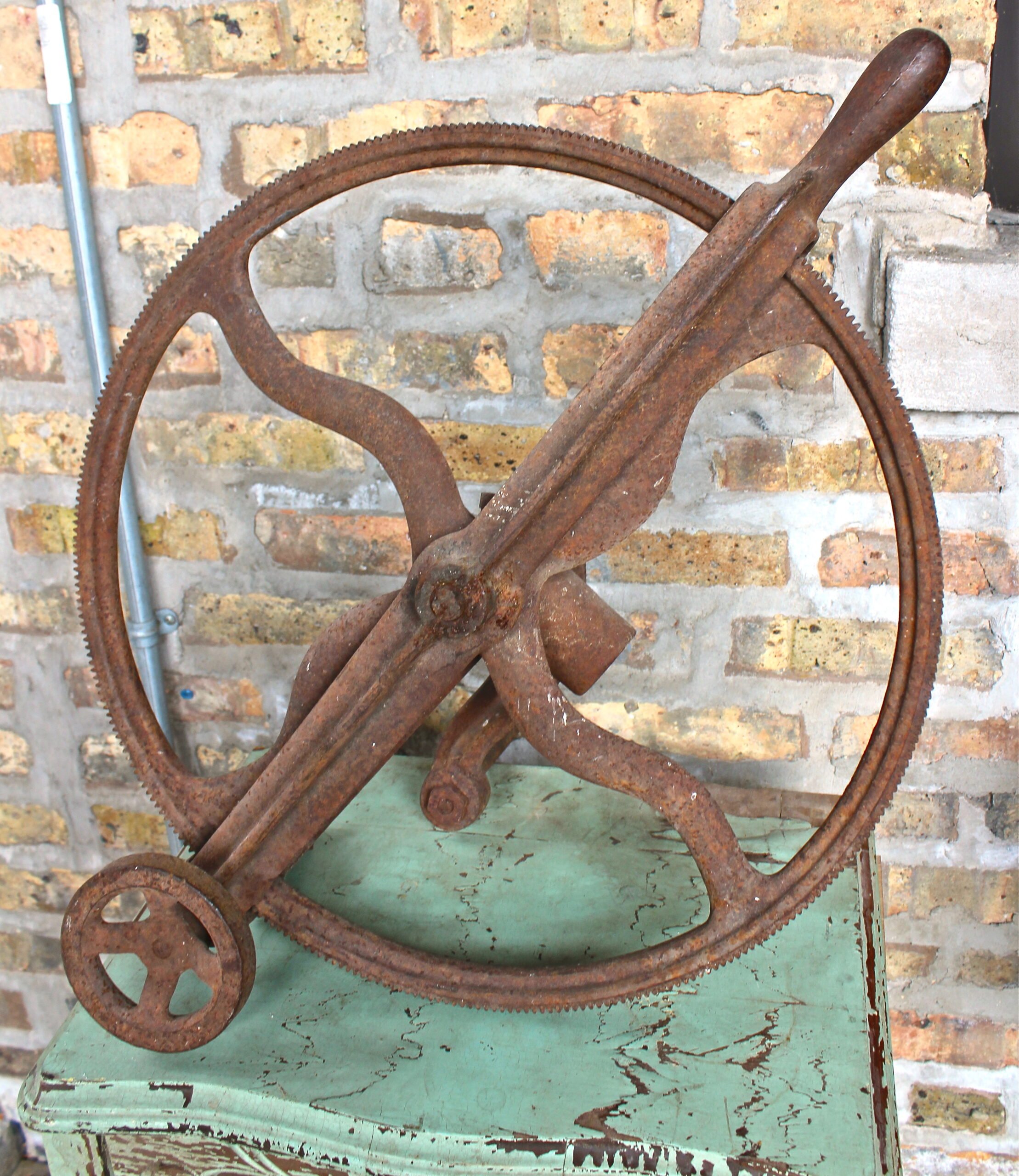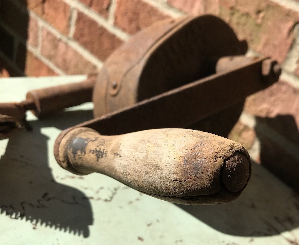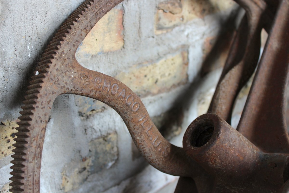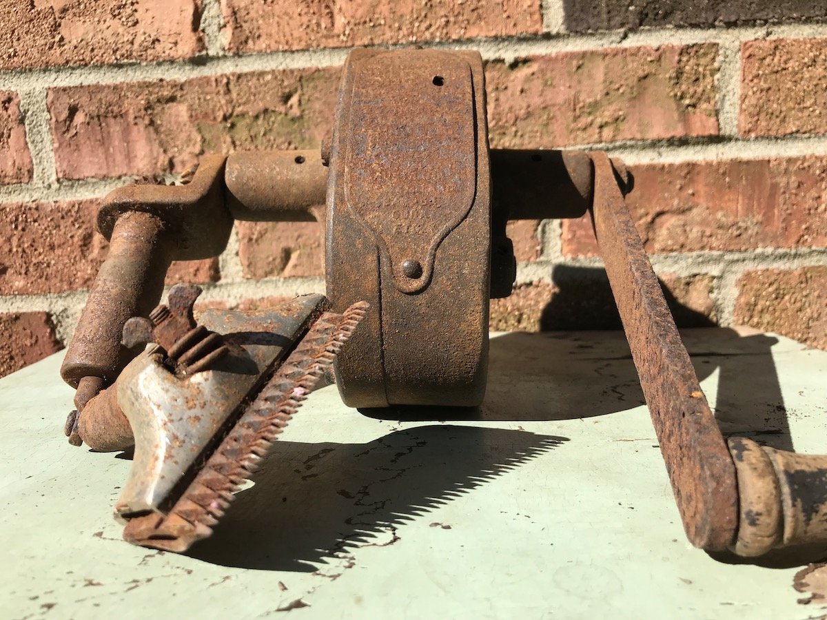 The Chicago Clipper, as evidenced by the example in our collection, was not exactly “portable” in the modern sense. The 18″ diameter crank gear alone—cut from solid metal rather than cast—weighs about 30 LBS, and that’s without the stand it likely originally sat atop. Still, it was a game changer, not only preventing the common problem of hair clogging, but also dramatically reducing the time and labor required to do the job. The operator simply needed to turn the crank, and the teeth on the edge of the gear would then “engage with a small hardened steel pinion,” according to a 1902 article in Iron Age magazine, “which in turn transmits the power to the flexible shaft and knives. …The clipper is alluded to as free turning, fast cutting, simple, and as permitting the clipping of a horse in less than 30 minutes. …It requires no experience to operate, and a small boy can turn the crank all day without tiring.”
