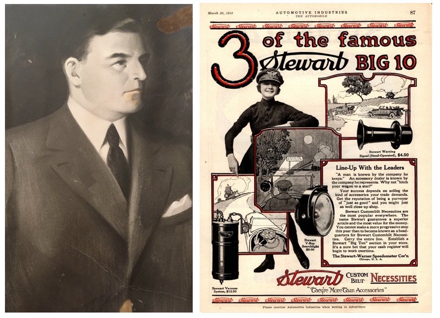 [Left: John K. Stewart, circa 1910; image donated by Stewart’s great-grandson R. Stewart Honeyman, Jr.. Right: 1919 advertisement for the Stewart auto accessory line of the Stewart-Warner Co.]
