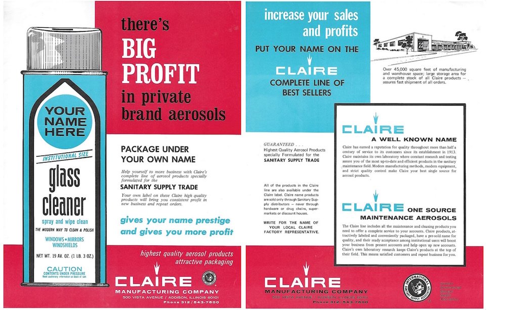 The Claire MFG Co. was founded in 1913 and is still in business today, with offices in suburban Downers Grove, IL. Best known since the 1950s as one of the pioneers of the aerosol spray can, the company has unsurprisingly had to endure some pretty hefty challenges to stay afloat—including adaptations to new environmental standards and several corporate buyouts. All things considered, though, Claire hasn’t deviated that much from its original focus. Cleaning products are still the crux of the business, and “Mr. Jinx”—the flagship brand that introduced the company to the world over 100 years ago—is still part of the fleet.