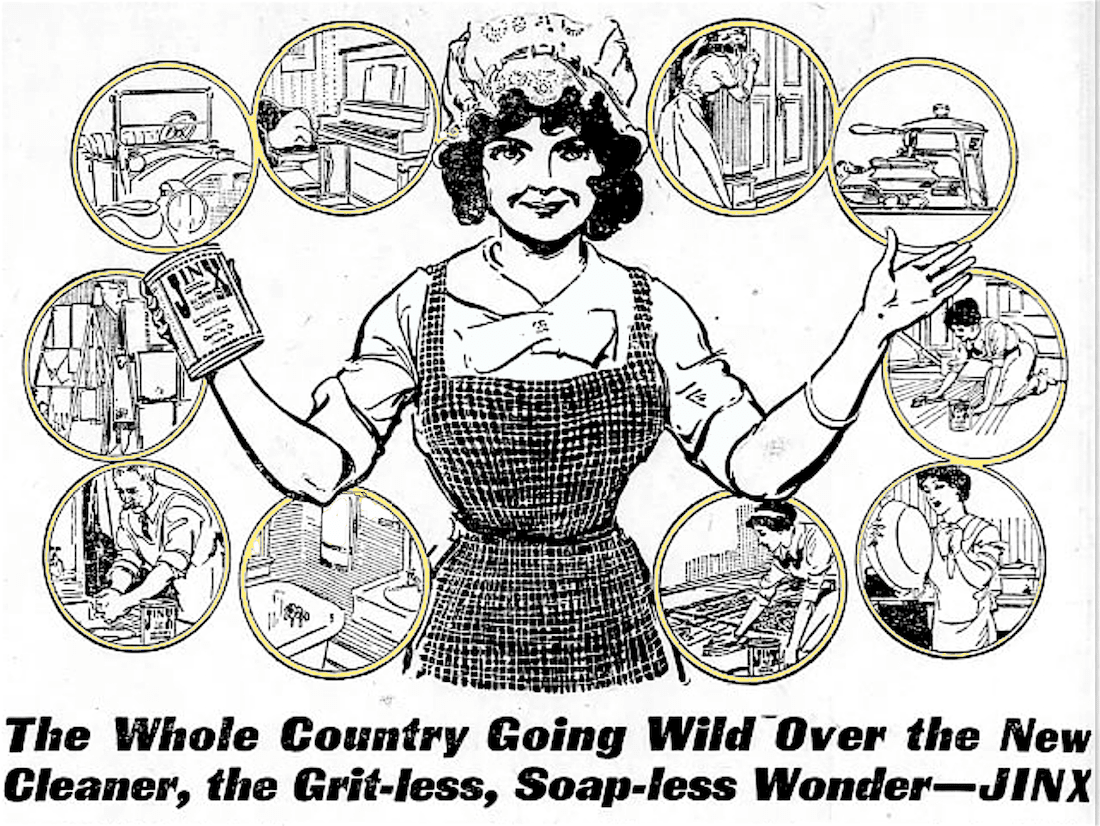 “You’ll hardly believe your own eyes when you see the marvelous cleaning power of this eighth wonder of the world, JINX,” another ad exclaimed. “You never would have dreamed that such a magic destroyer of dirt, grease, smudge and grime could ever exist even in this twentieth century.”