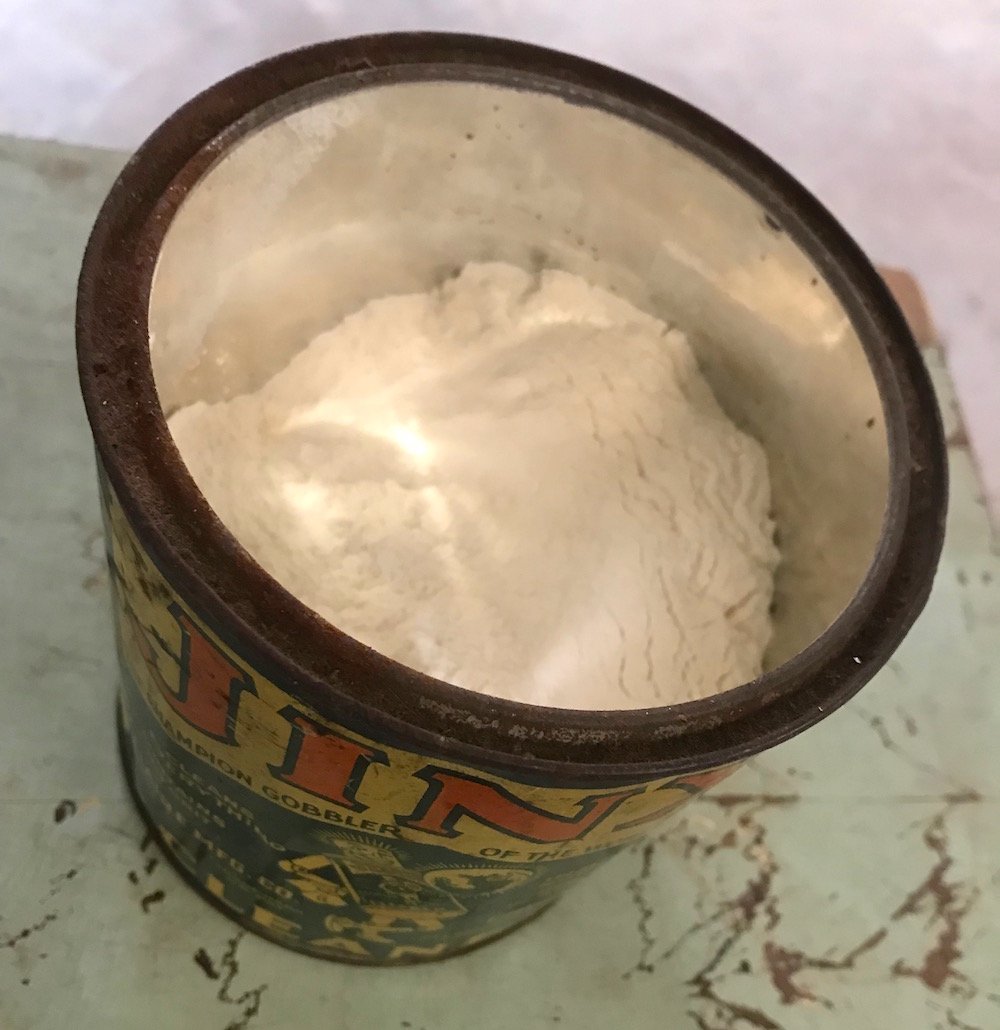 Since the Jinx solution is compared to a jelly-like paste above, and is more poetically described in original ads as “soft, satiny, creamy and pure white,” we were a bit perplexed to remove the lid of our museum tin only to find a clumpy, flour-like powder instead. It’s certainly logical that 100 years of dormancy will change the chemistry of a thing. But since we don’t know what that chemistry originally was, we can only speculate.
